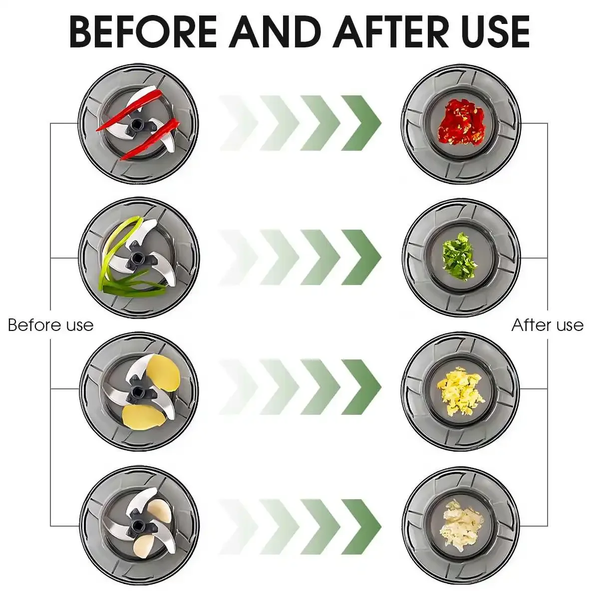 1.Time-Saving Solution: Prepare your meals with ease, our garlic chopper allows for swift chopping of garlic and onions in just 10 seconds, saving time and effort. No more unwanted odors, enjoy fresher ingredients without the fuss.